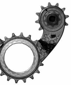 La majorité des marques de chapes oversize utilisent des tailles de galets relativement similaires, dont le profil de dents est assez bas. Cela a pour conséquence de nécessiter une tension de chape importante pour s’adapter aux contraintes de ligne de chaine. La chape AbsoluteBlack Hollowcage utilise un ressort bien moins puissant que toutes les autres chapes du marché tout en conservant une haute qualité et une grande précision de changements de vitesses , ceci grâce au profil plus haut des dents de galets et à leur rigidité à quoi s’ajoute la construction spécifique de la chape qui lui permet de s’aligner dynamiquement avec l’angle de chaine.