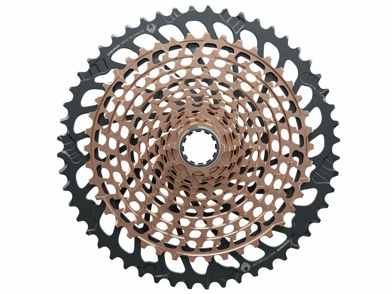 La cassette 12 vitesses Sram XG-1299 XX1 Eagle 10-52 dents s’appuie sur les mêmes technologies que son homologue 11 vitesses pour sa construction, à savoir X-Dome et X-Glide 2. La première permet de créer une cassette très légère et solide avec les 11 premiers pignons usinés dans le même bloc d’acier cromo et la technologie X-Glide a été optimisée pour améliorer les performances de passages de vitesses. Elle s’installe sur les corps de roue libre XD et et est ici déclinée dans une version Cuivre.