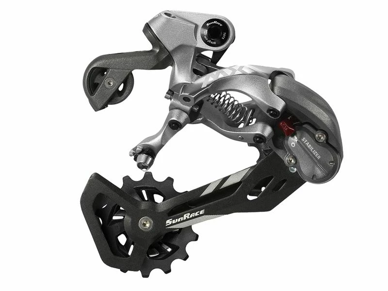 Tout nouveau dans la gamme Sunrace, le dérailleur MX60 est compatible avec les systèmes 10, 11 et 12 vitesses. Il est doté d’une chape en aluminium et d’une fonction « stabilizer » qui permet d’augmenter la tension du ressort de rappel et ainsi éviter les mouvements de chaine.